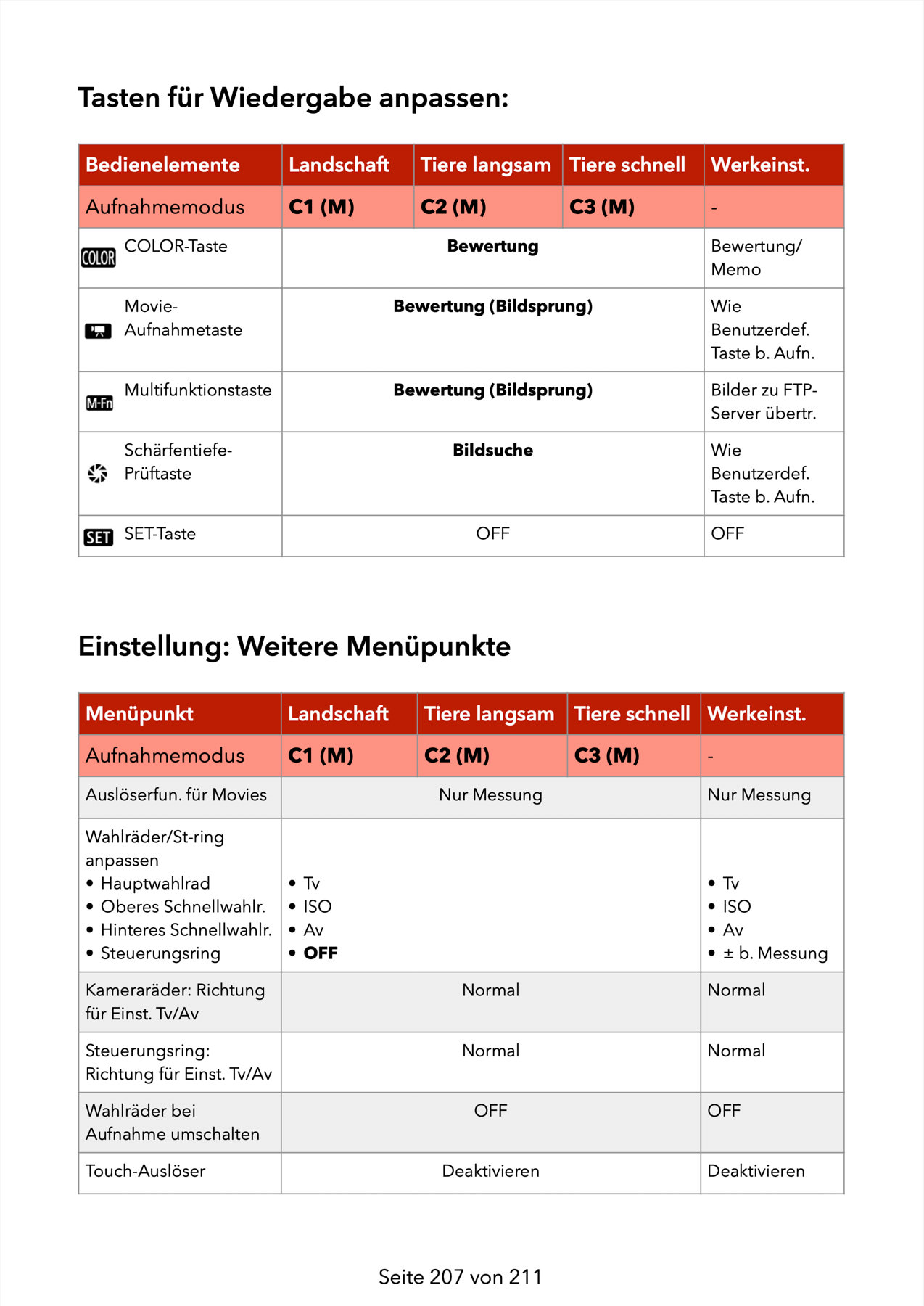 - Vorschläge für Tasten-Konfigurationen für unterschiedliche Aufnahmesituationen